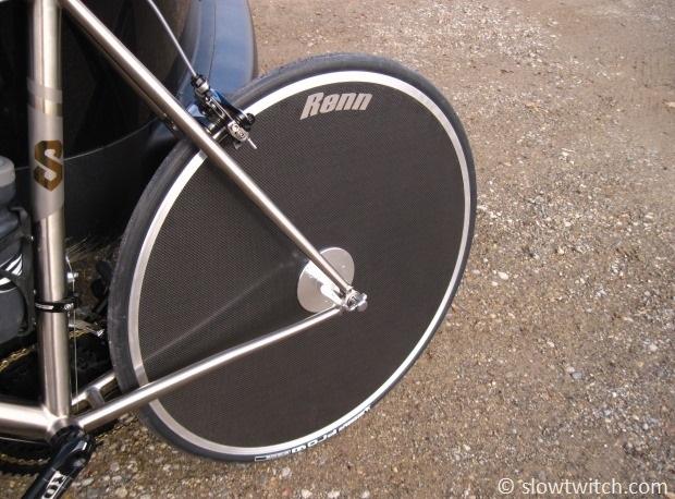 This could be good or bad. Some manufacturers aim for the smoothest possible rim/tire surface, such as Mavic’s CXR series, or Bontrager’s R4 Aero tire. Others, such as Zipp and Reynolds, use small ‘air interrupters’ – dimples, voids, and lips – to create a vacuum or a boundary layer of turbulence. Is the ‘lip’ on this Renn good or bad? I don’t know, but at this price point, I’m not going to lose much sleep over it. Your only other choice in this price range is a wheel cover for your existing spoked wheel, which tends to have a ‘lip’ of its own, too (depending on the fit with the rim it mounts to).