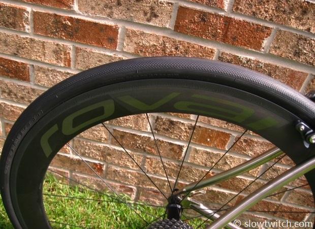 While the wide tires undoubtedly have an aerodynamic penalty, I really like the look of the wheel-and-tire combination (Batman would ride them). At about 80psi, the ride quality is outstanding. Riding around on rough pavement in the aerobars is an entirely different experience than on a standard 23mm tire… as in – you can actually do it without cringing.