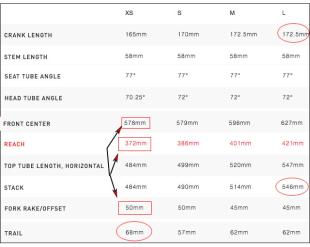 Specialized won’t make the bike with a lower trail number or a smaller front/center (BB to front wheel axle). I would prefer the XS to have a front/center more like 565mm (which it could do because it’s spec’ing a 165mm crank), it needs a steeper head angle, and a fork with more offset (like, 55mm). but that would mean yet another fork mold you might say. Maybe. Or, maybe just another thru axle placement.
