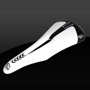 The important elements of tri bike saddle shell shape are: flat across the top in each axis: front-to-back, and side-to-side; a long "nose" before the saddle widens out via its flanges (or, even a lack of fully vested flanges). A good example of this is John Cobb's SHC (pictured next down from the top). This saddle may or may not be the saddle in the Cobb line that you'll find most comfortable (many prefer Cobb's more padded saddles, like the Max, which also features narrow flanges). But it's the perfect execution of flange width reduction.