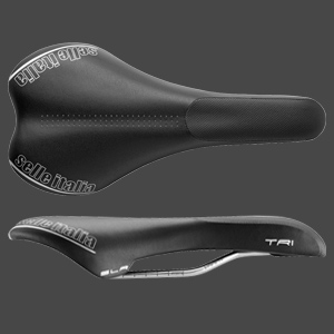 An example of a saddle that incorporates most of these features is the Selle Italia SLR Tri Gel (pictured third from top). It's flat front to back, left to right, and as long as you don't move to the back of the saddle the flanges don't get in your way. Note that what makes the SLR and the Fi'zi:k Arione great shells—bases—for tri saddles is the very feature which I'm less enamored with when applied to road race saddles: a flat front-to-back aspect.