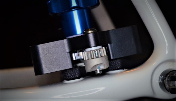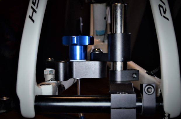 In theory, the operation of the DT-5.2 is fairly simple. An adjustable rod is placed in the dropouts of your frame/fork, where the hub would ordinarily sit. A vertical rod bolts on to this surrogate hub, and an articulated arm slides up and down on the vertical rod. At the end of the articulated arm is a rotary cutter head.