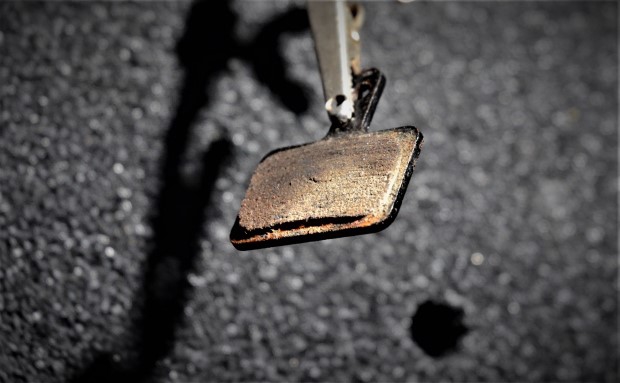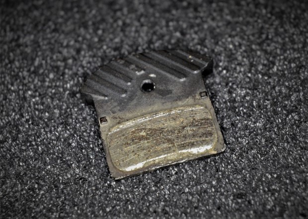 If your pads look like the one in the pic, it means your brake is mounted high relative to the rotor. The amount shown in the pic is pretty typical. Any more than that, and you should do something about it. That “something” is… complicated. More on that in a bit.