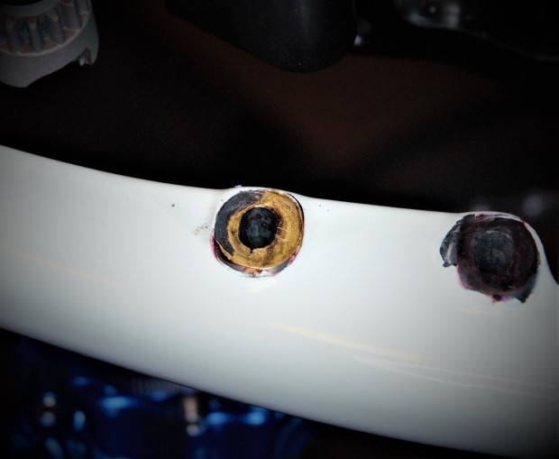 It should be pretty obvious from that first picture why it was more or less impossible to adjust the brakes on this bike. The mounting hole to the right was lower than the one on the left, and the brake was only making contact from about 9-12:00 on the left hand mounting surface. Every time this brake was tightened down, the brake would slide ever so slightly counterclockwise and down, taking the brake out of plane with the rotor. As a result, the brakes always rubbed ever so slightly, they pinged with most rotors, and they squealed if there was even a hint of moisture in the air.