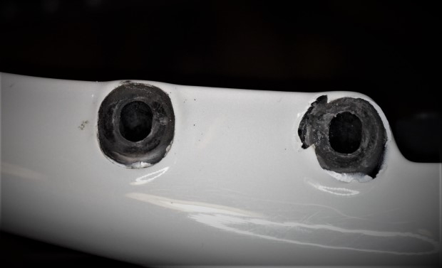 In the rear, the brake mounts on the frame are elongated ovals.