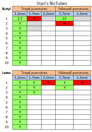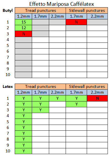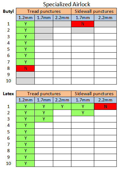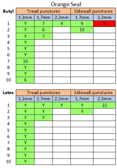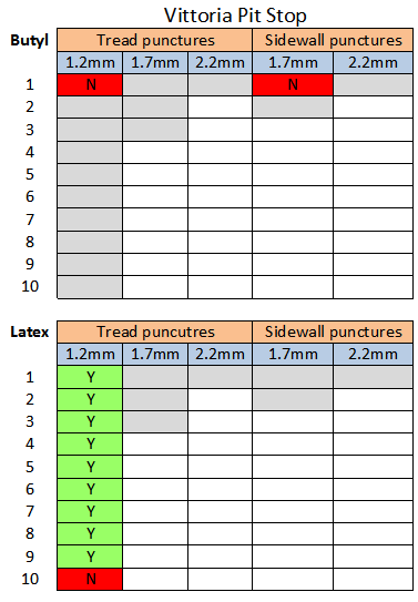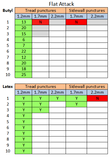 As you can see, it fared noticeably better in latex tubes than butyl. The 1.7mm latex punctures through the tread and sidewall sealed instantly. The smaller puncture in the butyl tube sealed quickly, but things turned for the worse as the puncture size grew.