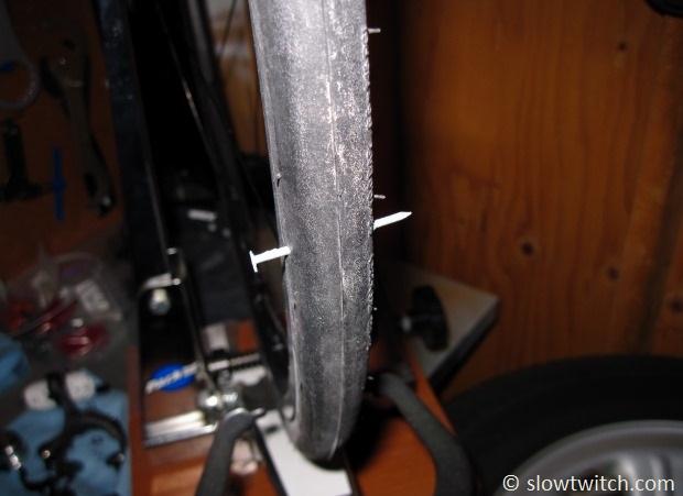 Second, this is clearly not a perfect test because the wheel and tire are unloaded (e.g. not being ridden). When a wheel is loaded, there is substantial deformation of the tire and tube during each revolution as it contacts the ground. While I would have loved to include that in the protocol, it just wasn’t feasible for an initial test. Outdoor riding has been impossible due to an incredible winter and high amount of snow, and I didn’t want to delay this already-delayed article any further. My main priority was to establish a baseline test protocol. Heck, I didn’t even know if I was even in the ballpark with my expectations. Would any of the sealants work? Or were my punctures all too easy, causing all of the sealants to pass with flying colors? While I’ve definitely had my fair share of punctures on the road, I’ve never done anything like this test. With any luck, it will give us good baseline information with which we can design future tests.