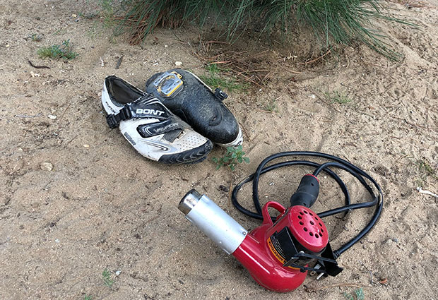 Shimano shoes used to be moldable, once upon a time. This was a big thing. Stores carried little ovens, or heat guns. This still is a thing if you’re a Bont user, and I have a heat gun, and I’ll use a heat gun on a Bont. (And just to demonstrate how beat my old Bonts were, here they are, and the heat gun.)