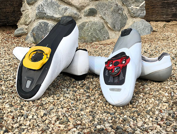 Because I am currently rotating between Speedplay Zeros and Garmin Vector 3s, I really needed now 2 pairs of shoes. And because I never screwed up the courage to plunk down for a pair of RC9s, I kept writing about them but without the firsthand experience of owning them. I thought it might be interesting to test this shoe against Shimano’s RC7, to see if there was a meaningful difference, to know if you need to spend the extra money for the top model. The RC9 retails for $425, and the RC7 for $225. (If you see these at lesser prices it’s likely they’re not the 2020 shoe.) I mounted the Garmin cleats on the RC9, and the Speedplay cleats on the RC7.