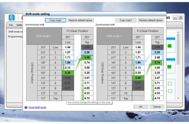 The screenshots sprinkled herein are just a couple you'll see when updating, adjusting, customizing your shift system in Shimano's E-Tube software.