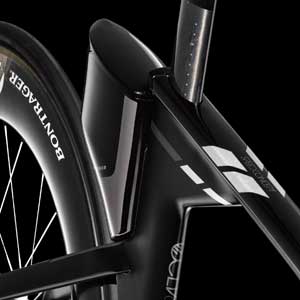 The rear bottle system is reminiscent of other systems in the past that were part rear fairing, part bottle holder. It seems like a nice attempt, and Trek says it’s actually more aero than nothing back there at all. Confirming tunnel studies decades ago by John Cobb and Steve Hed, Trek’s data on this seems to suggest get those bottles low or, at least, not too high. (Plus, it’s hard to hike your leg over a bike that has bottles sticking up behind the saddle!) I just don’t like bottles back there at all, so, I’m not the right guy to write about a behind-the-saddle bottle holder.