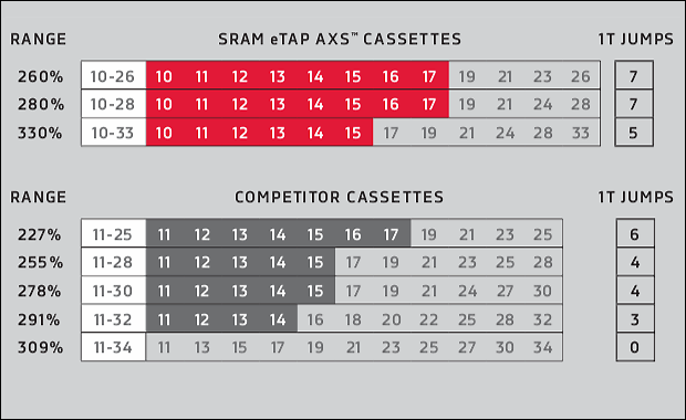 But these rings are too small! Yes. If the 1st position cog had 11 teeth. But SRAM’s X-Range gearing relies on a 10t first position cog, and 12 cogs in the rear. The 3 available cassettes are: 10-26; 10-28; 10-33.