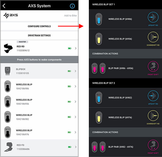 You and I must follow this process exactly, when pairing our tri bikes (or road or gravel any AXS-equipped bike). Once done we’ll be able to pull up these connected devices in the AXS app and when you see the Wireless Blips on the screen (above left) you can click Configure Controls, at which point you pull up the screen above right and can tell each shifter what you want it to do exactly, if something other than the default operations.