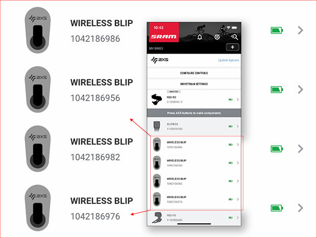 You don’t need an AXS connection component to be on your tri bike. You just borrow the use of one for pairing your Wireless Blips. In my case, I have other bikes that are SRAM AXS shifted. I just placed my tri bike next to my gravel bike, and used a shifter on my gravel bike to pair the Wireless Blips with my tri bike’s derailleurs. The process for pairing shifters and derailleurs in an AXS bike is this: