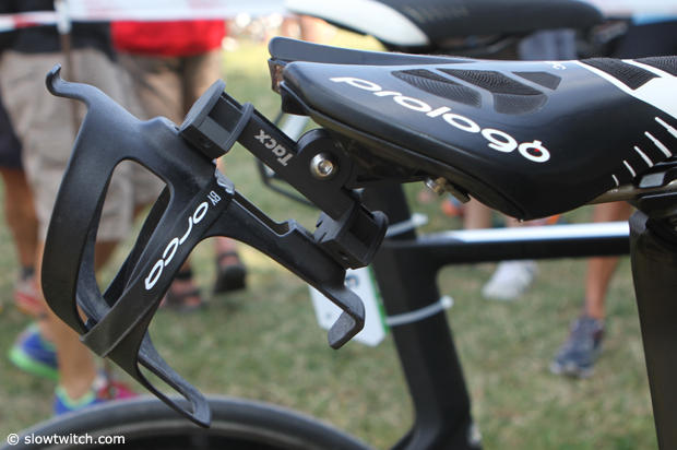 A Tacx mount allows him to have a cage close under his saddle.