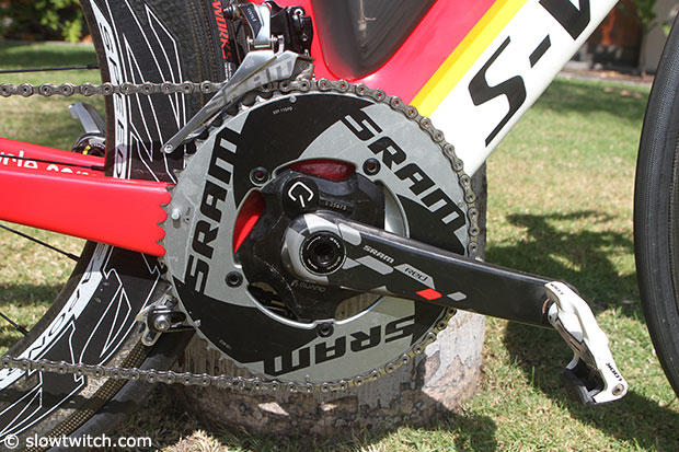 SRAM Red cranks with Look Keo pedals and a Quarq power meter and 55/42 rings.