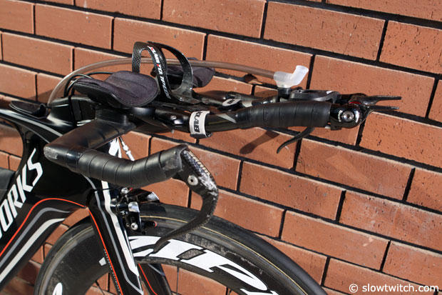 We had a chance to look closer at the Specialized S-Works Shiv of Ironman 70.3 World Champion Melissa Hauschildt at the Specialized wind tunnel in Morgan Hills, California. We will have a separate feature about her tunnel experience but for now here is her World Championship bike. Most of the other Specialized sponsored Pros showed up in Vegas on funky anniversary painted edition frames, but Melissa Hauschildt did not get hers in time before the big race. But since she crashed on the slick road with a few miles to go that may turn out to be a blessing in disguise. She had however changed a few things on the bike she raced earlier this year and here is what we found.