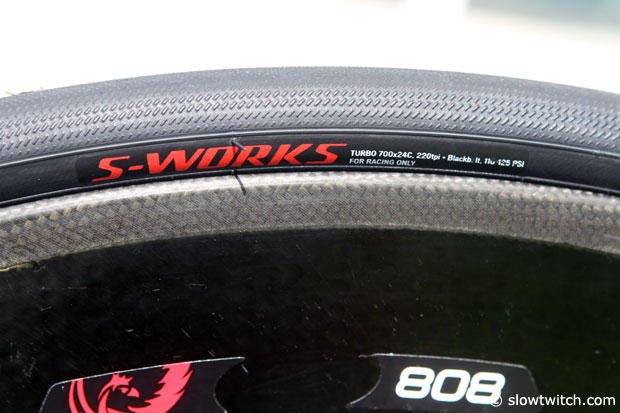 Specialized S-Works 24mm Turbo tires front and back on Zipp 808 wheels.