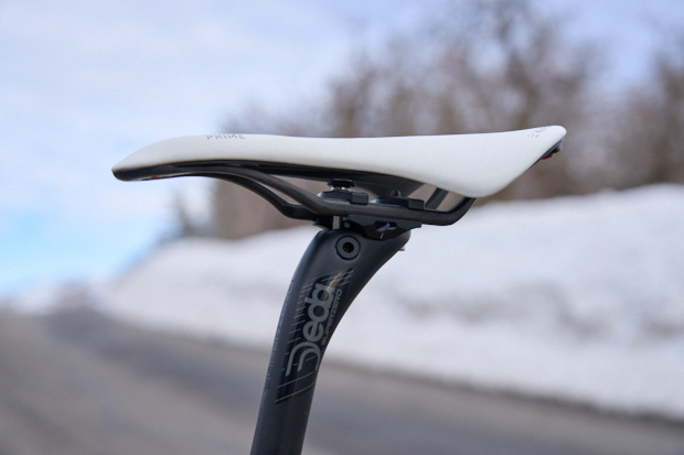 DEDA superhero Carbon SB 22mm seat post and Italian saddle maker REPENTE Quasar black saddle.