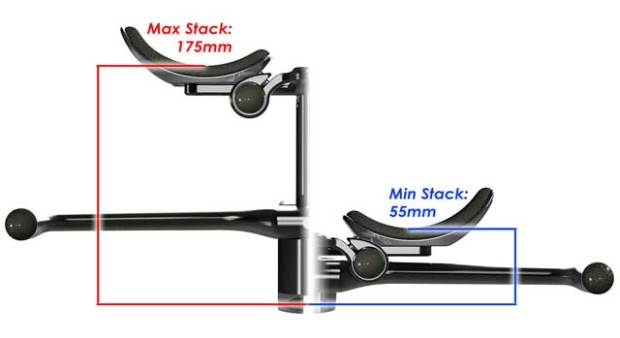 The way I understand this bar is that the minimum height from the headset top bearing to the pad is 55mm. Now, you might say that isn?t so low, many bars are in that 55mm to 60mm range. No. That?s from the pursuit bar center (bar bore). This is from the headset top bearing. So, you add 30mm or so to that typical 60mm pad height and what you get from a typical bar (with a slammed 17? stem) is 90mm of pad height from the top bearing. This bar is 55mm from the frame, and in comparison The Culprit?s bar is 59.5mm + 16mm (if you use Culprit?s stem) = 75mm of height, i.e., the Culprit?s bar + stem is reasonably low, the TriRig Alpha One is class leading low.