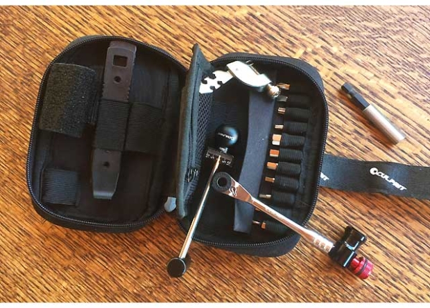 I haven?t actually got my hands on either of the aerobars that I?m writing about today. But I do have this toolkit. It?s the saddle bag, of course, and you velcro a spare tube (or two) to the outside. It?s got both a mini ratchet and a torque wrench with hex bits from 2mm to 8mm, and also Torx from T10 to T25, and other bits as well. It has a CO2 inflator, a patch kit w/6 patches, a chain tool, spoke wrenches, tire levers, a place for CO2 cartridges and then a holder for credit cards, license and so forth.