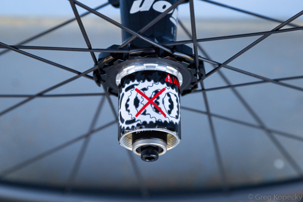 I found the hubs to be quite interesting. The front uses relatively standard lacing, with crossed spokes on the disc side, and radial lacing on the non-disc side. Note the 2:1 lacing to help even out spoke tension.