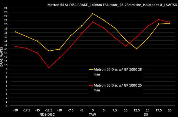 Vision shared this data with us from the San Diego Low Speed Wind Tunnel. This suggests that the minimum recommended tire size is 25mm. Tests were performed with both the 25mm and 28mm Continental GP5000.