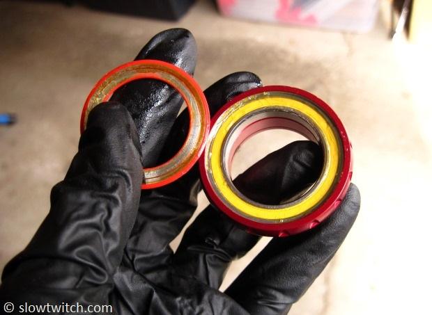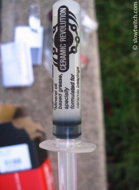 Take note: Make sure that the bearings have grease underneath the secondary outer seals (orange part). Also be sure to grease the crank spindle and inner bearing races. FSA provides a syringe of their own special grease with the bottom bracket: