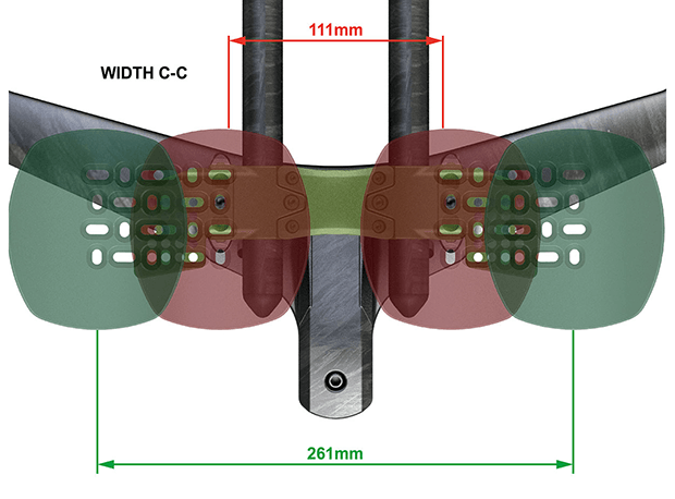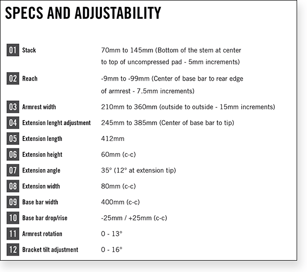 For example, if your position requires your armrests to be 650mm above the bottom bracket and 520mm in front of it, every bike should have a solution for that, which might be: Frame size L, armrests pulled back from their center/neutral position 20mm, and those armrests pedestaled 30mm from their base position. Voila. Solution. (Along with the appropriate width adjustment, and with extensions cut or adjusted to their proper length.)