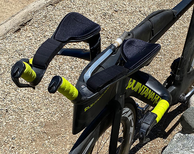 Or, I can do that, as long as I’m not racing in an event governed by the UCI Cycling Regulations, and in triathlon we are generally not governed by those rules. However, so far Vision has not made their aerobars with full length pads that allow a user to deploy that product in the way I would most like to. So, I did what I tend to like to do, which is to dive into the bowels of my workshop and come up with my own jury rigged solution.