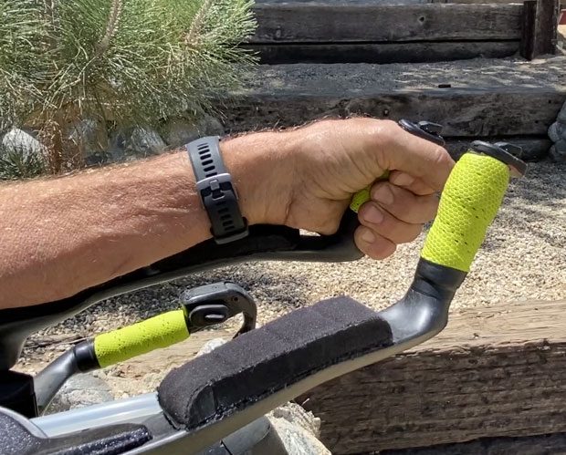 I used an armrest from another aerobar brand, and placed this extra padding up the armrest. I didn’t need it the entire distance. In fact, I specifically omitted placing the armrest where my palm rests on this bar. I tried the pad up forward of where my wrist is, and I found that it was not ergonomic. I ended up with the armrests place where you see them, because this is what works. This is how I can place roughly half my weight back near my elbows, and half on these forearm rests.
