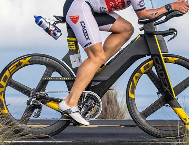 Obviously the biggest overall winner in Kona was Zipp. They continue to dominate the wheel count with legacy wheels and new, OE plus aftermarket, Zipp just operates on all cylinders. One of the cleanest, best set ups in the race was the Schwalbe prototype tire (a new Pro One TT, but Schwalbe won’t confirm that) in a 28mm width mounted on a newly launched Zipp 858 front and rear. This was a nice match, Sebastian Kienle was on this as well as Florian Angert (he, or at least his front wheel and tire, and pictured in the image above). To me, this is one combo of the future. It has it all: Aerodynamics, handling, comfort, speed, flat resistance. I also felt that CADEX made a splash. It’s a new wheel brand, only recently out with good aero wheels and with supply chain problems I’m surprised it found a way to get 67 wheels in the race. It also, by the way, was ridden by the 1st and 3rd place finishers in the men’s race; and it just “won” the 70.3 Worlds in St. George in the men’s race.