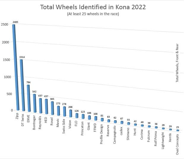 Hayes (known for disc brakes) bought Reynolds Composites 4 years ago and while Reynolds still ranks high in the wheel count, that is I guess my definition of a “legacy” product: a brand that remains high in the count, but without new products purchased by contestants. I say this because it seems to me Hayes uses its Reynolds brand for products that don’t anymore include tri or TT products. I didn’t see any Reynolds wheels in the pro race. I write this while acknowledging Reynolds makes and sells an 80mm wheelset. And, inexplicably, Reynolds remains pretty high in the count year over year. I just don't know what to make of this brand.
