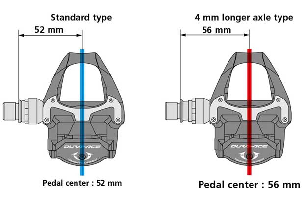 Shimano and Speedplay are the 2 major brand options for longer spindles (and then there are smaller brands, like Keywin). The typical distance from pedal shoulder to pedal-center is 53mm. Almost all pedals are this, plus or minus a millimeter at most. Speedplay included. Shimano included. Shimano adds 4mm to its spindle length if you buy that road SPD pedal with the longer spindle. This works for me. Speedplay offers 56mm spindles, and 59mm (which I ride when I can get them), and 65mm.