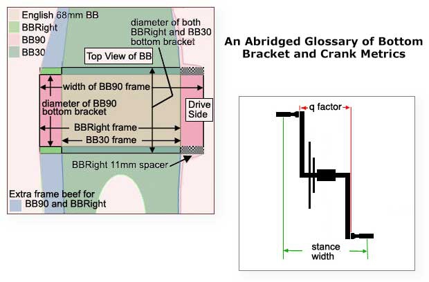 This distance the cranks, or the pedals, sit apart from each other is either Q factor, or stance width, depending on what we’re referencing. As the image above illustrates, stance width is the distance from the center of the pedal platform across to the center of the opposite pedal’s platform (if you could imagine your crankarms both pointing up or down, instead of one pointing up and one pointing down). Q factor is the distance from the pedal shoulder – where the pedal faces up against the crankarm – to the opposing crankarm’s pedal shoulder. The image above also shows some bottom bracket standards, which I’ll talk about below. Just, as you can see, one could change the stance without changing the Q factor, simply by putting a pedal on the bike that has a longer spindle. My instinct tells me the often-unacknowledged reason for a longer spindle – my reason – is actually the reason most people have for needing that longer spindle, and I reference the bottom bracket standards above because this may help explain how we got to where we are today.