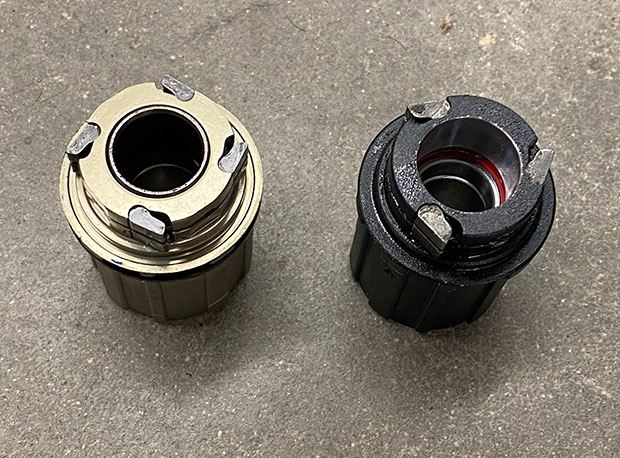 Above is the style of hub you’re probably used to owning. What you see here are variously called cassette assemblies, or driver bodies, and they are generally interchangeable. They share the same inners, but the cassette body is either a Shimano style or perhaps a SRAM XDR style (if it’s for 12 speed), and it's SRAM XDR driver body you see used in the DT Swiss video above. These driver bodies above have 3 and 4 pawls respectively, or up to 6 pawls, and you can see both a 3 and a 4 pawl driver body above, made by different wheel brands. This is the design these new ratchet-style hubs are gradually replacing.