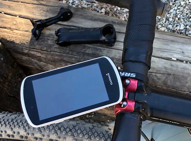 As you’ll note in the image just above, on this particular bike I had a garden variety Easton stem of some older vintage and the stem is fine. I’m a snob about some things, but not stems. A stem’s a stem. But If you look at me trying to mount a largish Garmin 1080 on a fairly long SRAM mount, the faceplate is too proud for the head unit. This is a common issue. We try to cram our head units past the protruding faceplate hardware and the mount on the head unit breaks.