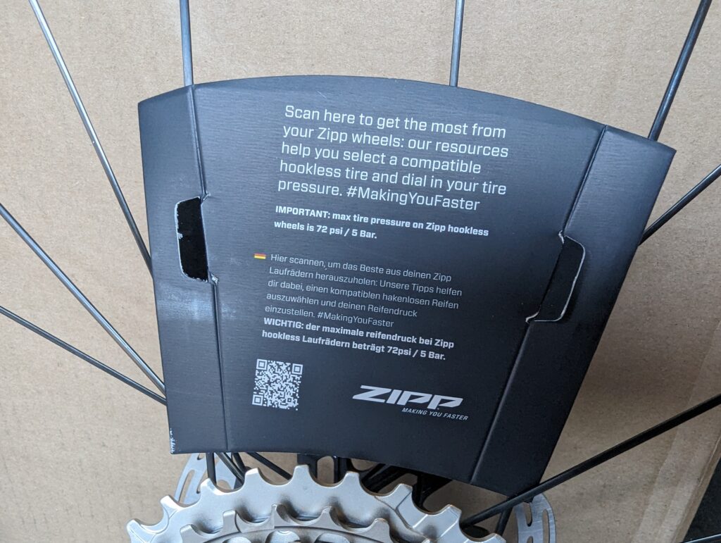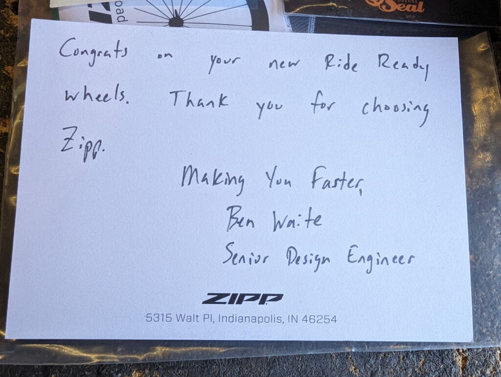The tires are filled with OrangeSeal, because Zipp has found that to be the most reliable sealant. While Zipp advertises that all you need to do when you get the wheels is to bed in the rotors, in my experience that does assume that you are already running those exact same rotors. In my case, I had to switch the mounting brackets for my calipers from 140mm → 160mm. But based on historical experience, I’d also say you will – if you’re not running SRAM’s Paceline rotors already – also need to deal with rotor alignment. Disc caliper tolerances are such that different rotors and different hub shells can cause some small amount of rubbing. I wouldn’t say this is necessarily a given – certainly the pro tour races all manage to have neutral wheel support without issue, but I also wouldn’t be surprised if a little bit of tweaking was required, especially if you are coming from non-Zipp wheels and non-SRAM rotors. Both because I was changing from Zipp → Zipp and because I had to completely remount my brakes to switch from 140 → 160 mm rotors, I can’t offer any direct experience here as to whether or not pumping up the tires was all I had to do. But certainly avoiding dealing with the mess of sealant and mounting tires was a welcome relief. The wheels came to me with just under 30psi in them. Not quite enough to ride, but certainly enough that there was no worry of sealant leaking around the bead.