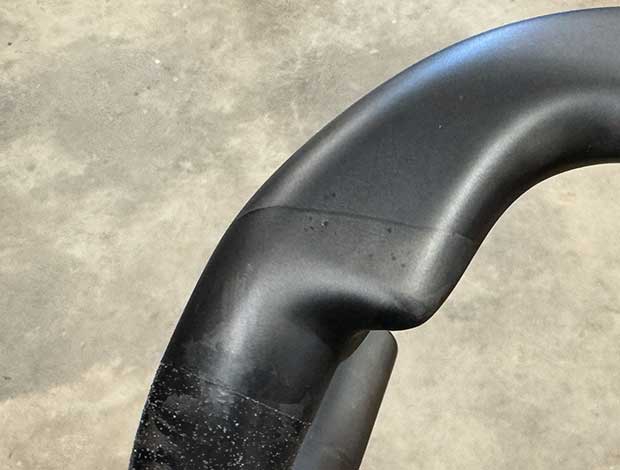This bar has a flat section on the top that’s quite comfortable and I use it quite a bit even if hoods are now the by-far dominant position. Which is a good time to get to my small gripes about this bar because one of them s flat section . The extra front-to-back material is all behind the centerline of the stem. Nothing in front. I’m okay with it. but it’s a kneecap biter for the wrong person. Someone built like me but who just wants a centimeter or two shorter cockpit. Contrast this with a handlebar made a dozen or 15 years ago by Oval Concepts, inset in the image above, with all the “aero” flat section in front of the centerline. I wish handlebar companies would consider this motif when they design their bars.