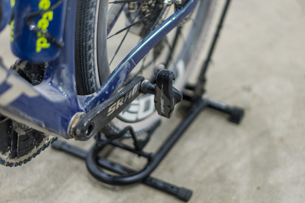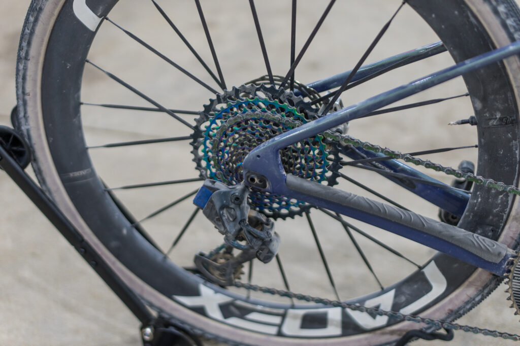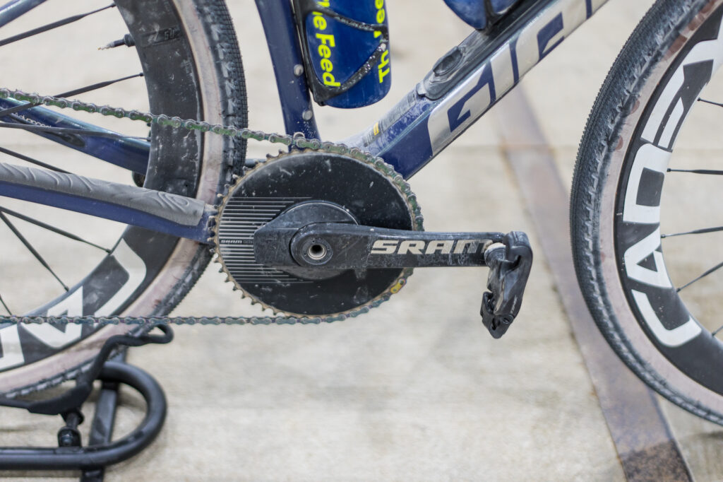 The SRAM Red 1X drive train features a 52-tooth front with a 10-52 cassette. The Time XPRO 12 SL pedals are “super light,” Johnston says. Any mud, though, and he’ll go back to the MTB version. Power is measured through the SRAM crank.