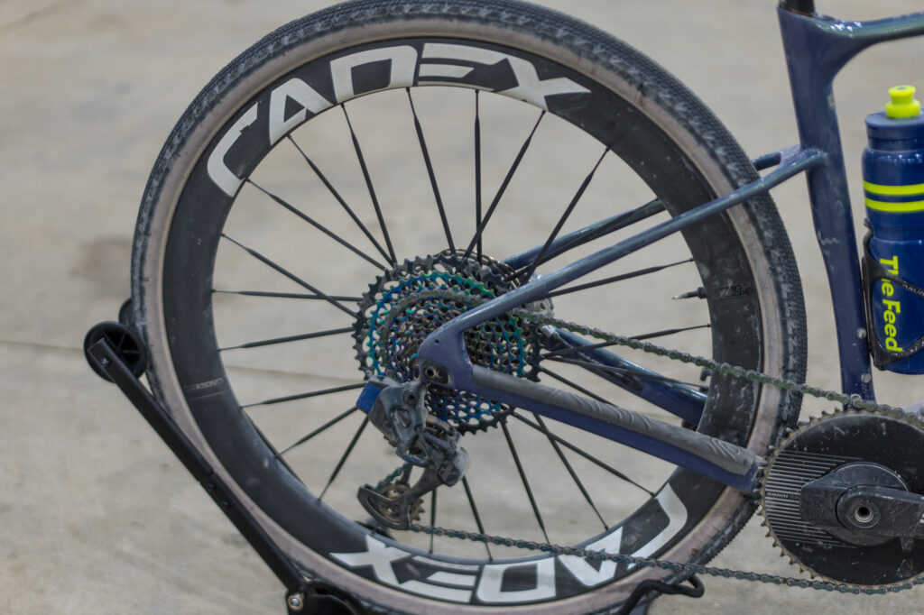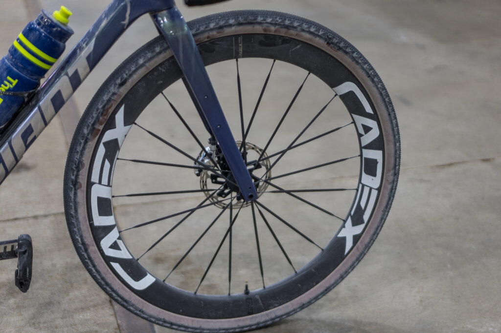 The Cadex 50 Ultra wheels have Kenda 45 mm Kenda Crusher tires rather than the 2.2 MTB tires he used at Unbound.