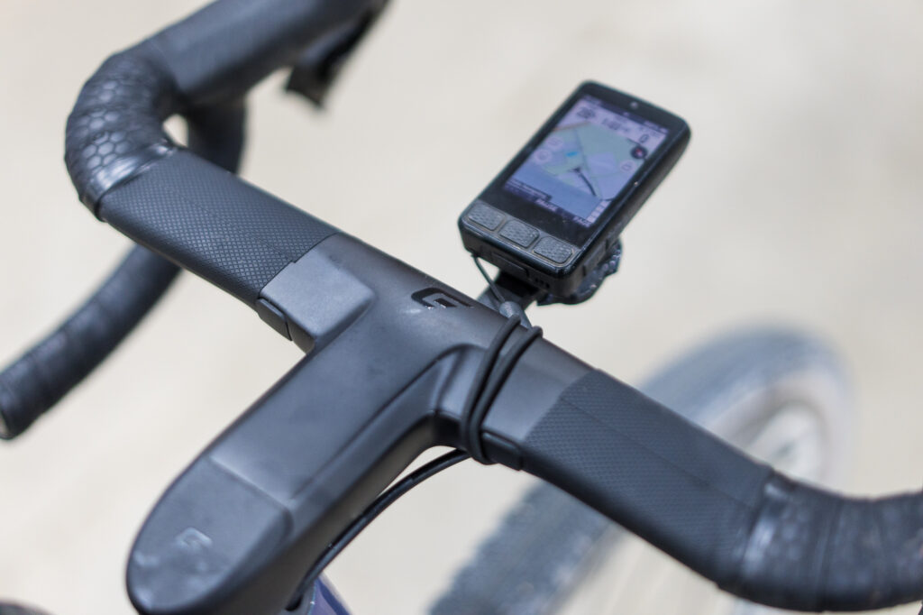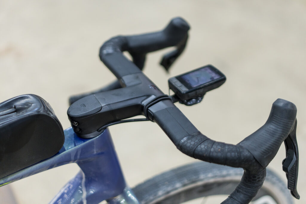 There’s a one-piece aero bar (38 mm wide at the top, 40 mm wide at the drops) and 110-mm stem from Cadex to go along with the Wahoo ELMNT Roam computer.