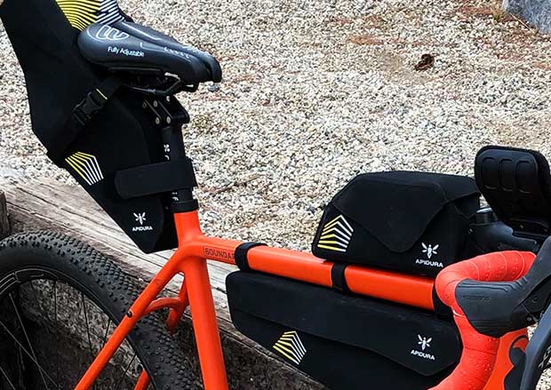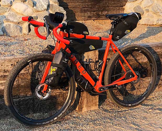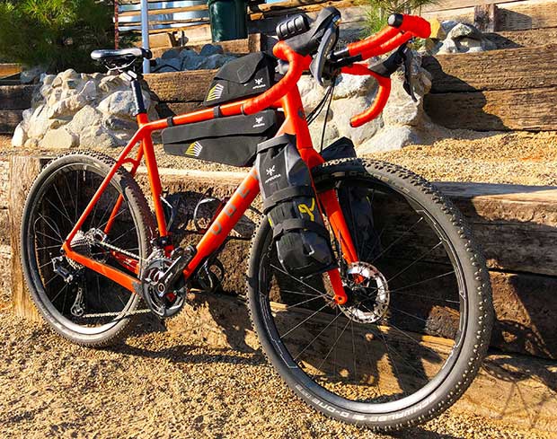The packs are from Apidura. Why? I asked our guy Matt Hill (Fredly on the Reader Forum) who knows about this stuff, and it was a short conversation, as in, 1 word: "Apidura." I’ll write more about packs in future installments. I don’t have the handlebar pack on the bike at the moment. I’m still wrestling with how to best use it, and this bike is set up how I’m riding it, and I’ve not got that pack on there yet. There is one pack I’m taking off: the Bento-like pack above the top tube. I have knee and thigh clearance issues with that pack, both in and especially when out of the saddle. However, the frame pack, below the top tube, no clearance problem there. That pack stays on.