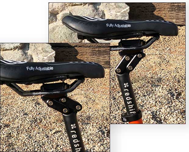 This seat post has a flip-forward position that adds height in the exact measure needed along with moving the saddle forward. So, when I go into the aero position, I move the saddle to its forward position. This takes some getting used to. You must reach back with one hand, grab the saddle flange, and give the saddle a little assist to move forward. When you want to move back, no need. Just push back with your thighs on the saddle’s flanges and it goes back by itself. But when it’s forward, presto, a damned good aero position. This is the Redshift Dual Position post, not its better known suspension seatpost.