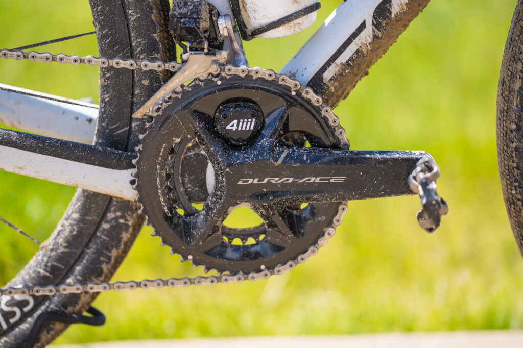 The front shifting is done with a Shimano Dura Ace derailleur matched with the Shimano Dura Ace crankset with 50/34 chainrings. There are Shimano XTR pedals and a 4iiii power meter.