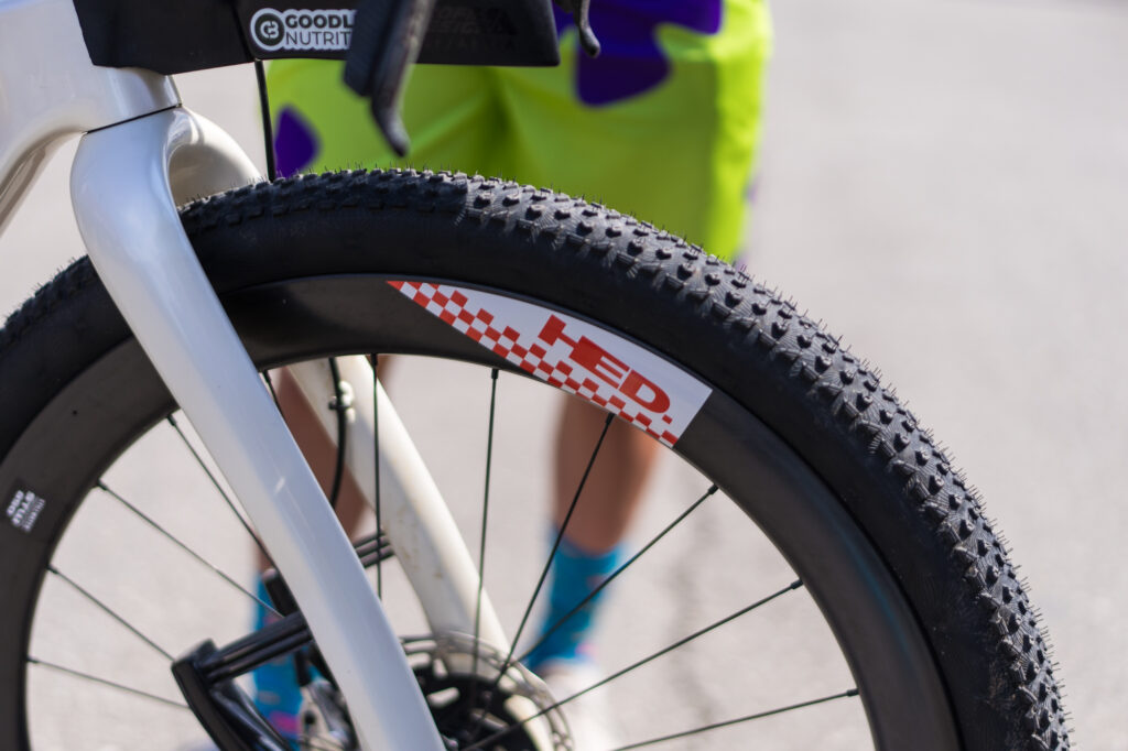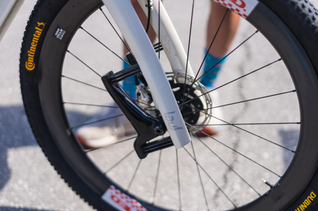 The front wheel is HED’s Stillwater – a 50-mm deep wheel with 28.5 internal rim width and 37 mm external rim width. Wark is running Continental’s Dubnital 2.2 Race Rapid tire.