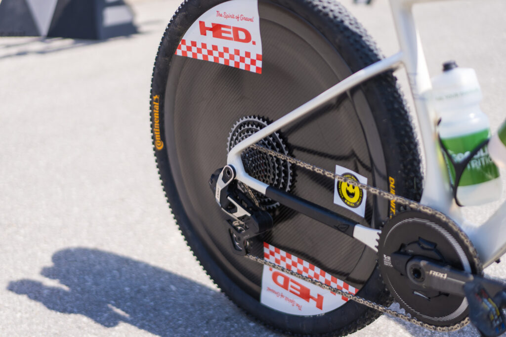 The rear wheel is a custom HED Stillwater rim with a disc fairing. It also has the Continental Dubnital tire on it.