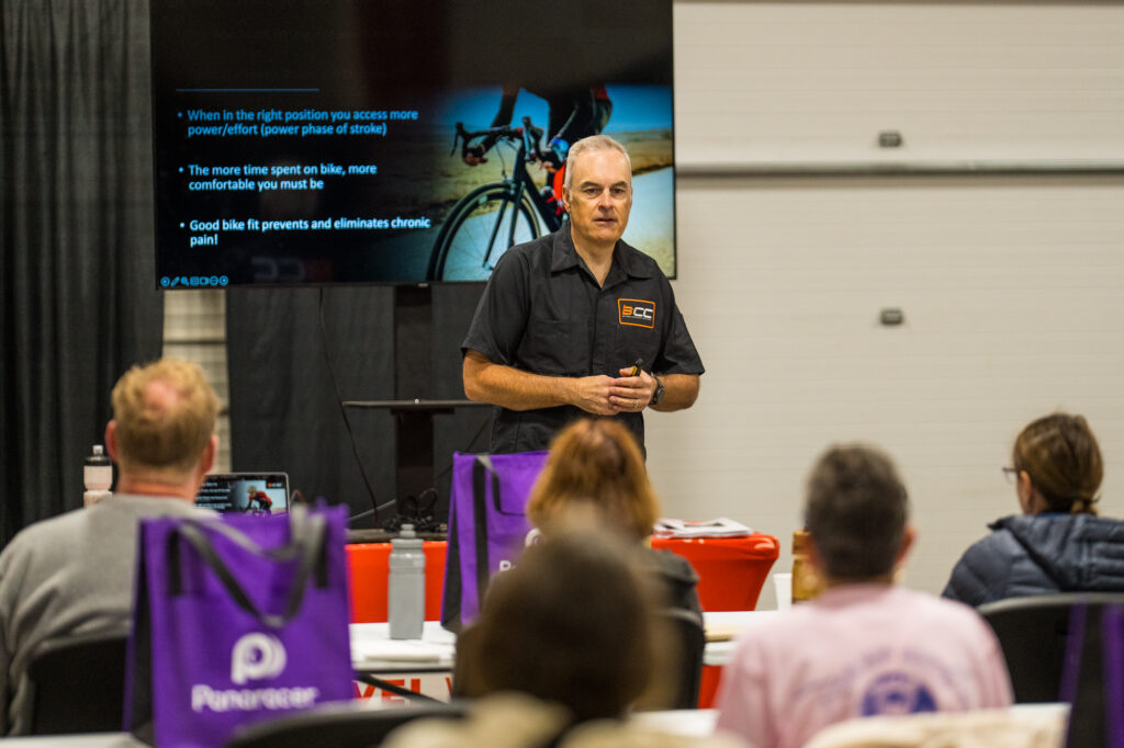 Sessions in the “classroom” include: basic and advanced training, nutrition, how to deal with basic mechanical problems (including fixing a flat), “making it home (when things don’t go to plan on race day or while training), and preparing for race day.