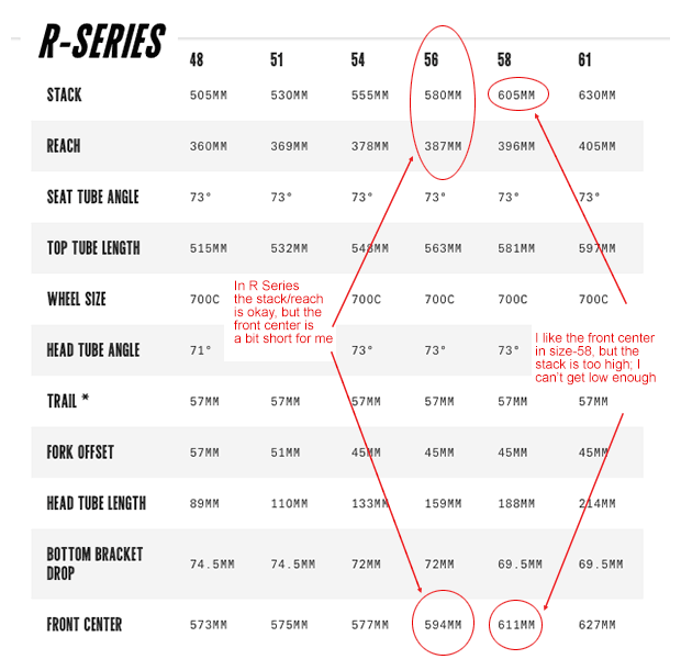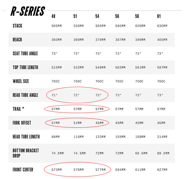 Same thing for women’s bikes. For years “forward thinking” (ba dum tss!) companies like Cervelo have made women’s bikes that fit appropriately (that don’t make you reach into the next county to grab the handlebars); that preserve the bike’s trail (more on trail below); that use 700c wheels; and that don’t have shoe overlap. How? By adding fork offset along with shallowing the head angle. Look at Cervelo’s R Seres (standard road) geometry chart below. Look at how the trail remains the same, but in the smallest size these geometric changes happen. You can see what Cervelo felt was the smallest front center it wanted: about 575mm.