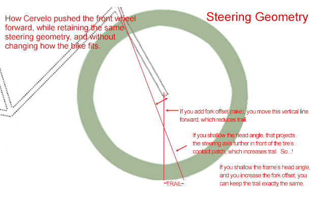 But the "trail" remains the same throughout that size run of Cervelo R series bikes, and that was a design imperative for Cervelo. What is trail? You can see it in the graphic just below. The “steering axis” is an imaginary line that runs right down the center of your fork’s steer column (the part of the fork that travels up through the frame). The contact patch of the tire is that point where the (front) tire contacts the ground. Let’s say you project the steering axis all the way to the ground. Here’s a pnemonic device for it: The bike’s “trail” is the amount that the contact patch of the tire “trails” the point where the steering axis would hit the ground (the projection of the steering axis). The more trail, the more the bike wants to self-center, i.e., wants to go in a straight line, wants to resist turning. The smaller the trail the more “lively” the bike handles. So, predictable or lively.